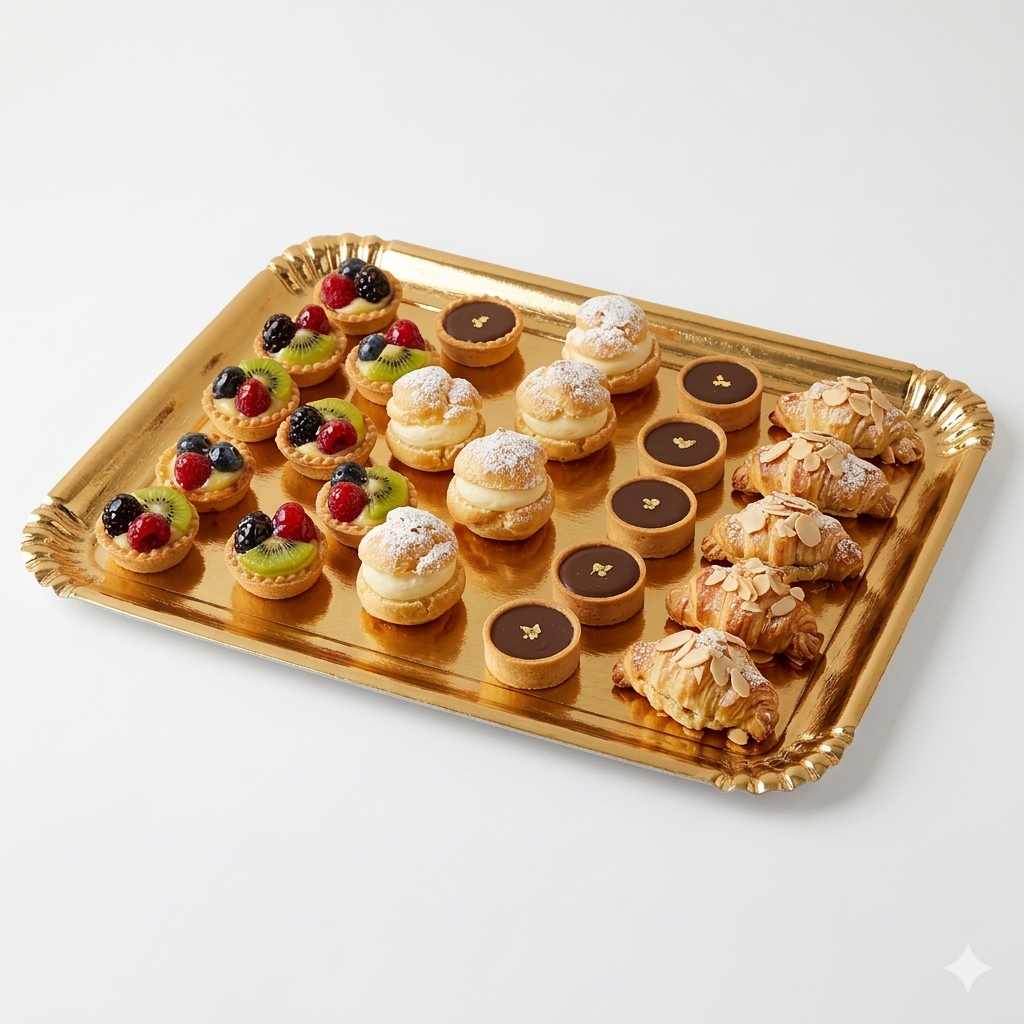 Bandejas rectangulares doradas nº 7 20×27, diseñadas para realzar cada creación con una presentación elegante y profesional. Fabricadas en cartón de alto gramaje y aptas para uso alimentario. Ofrecen una base firme, segura y resistente.