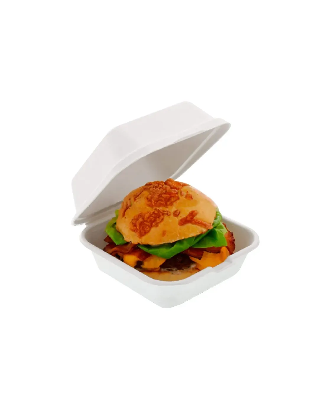La caja para hamburguesa de fibra de caña (15,2 × 15,2× 7,7 cm) es una opción elegante y sostenible para presentar y transportar tus productos. Fabricada con fibra de caña de azúcar, este envase biodegradable y compostable ofrece una resistencia notable, absorbiendo la humedad sin comprometer la textura del alimento
