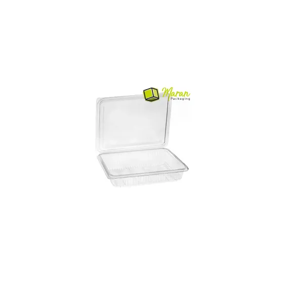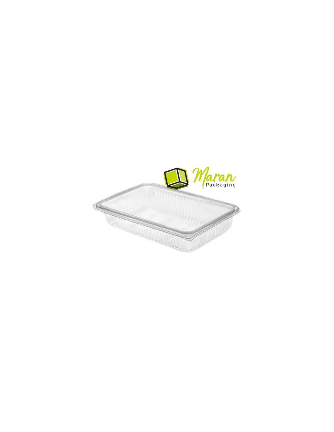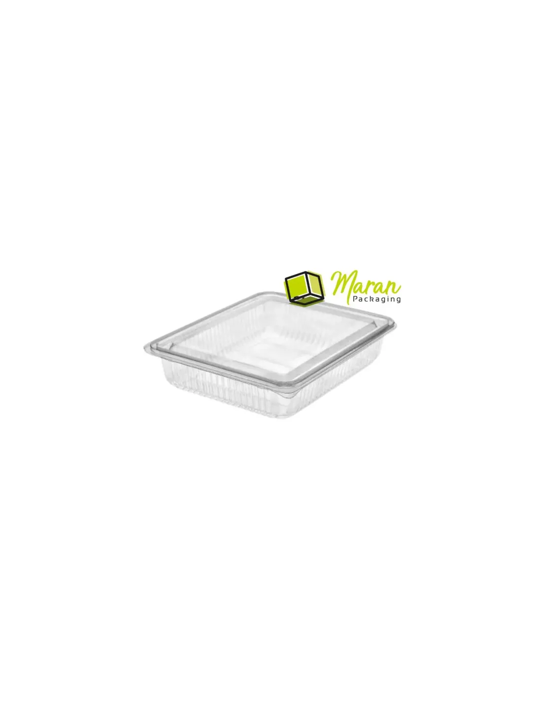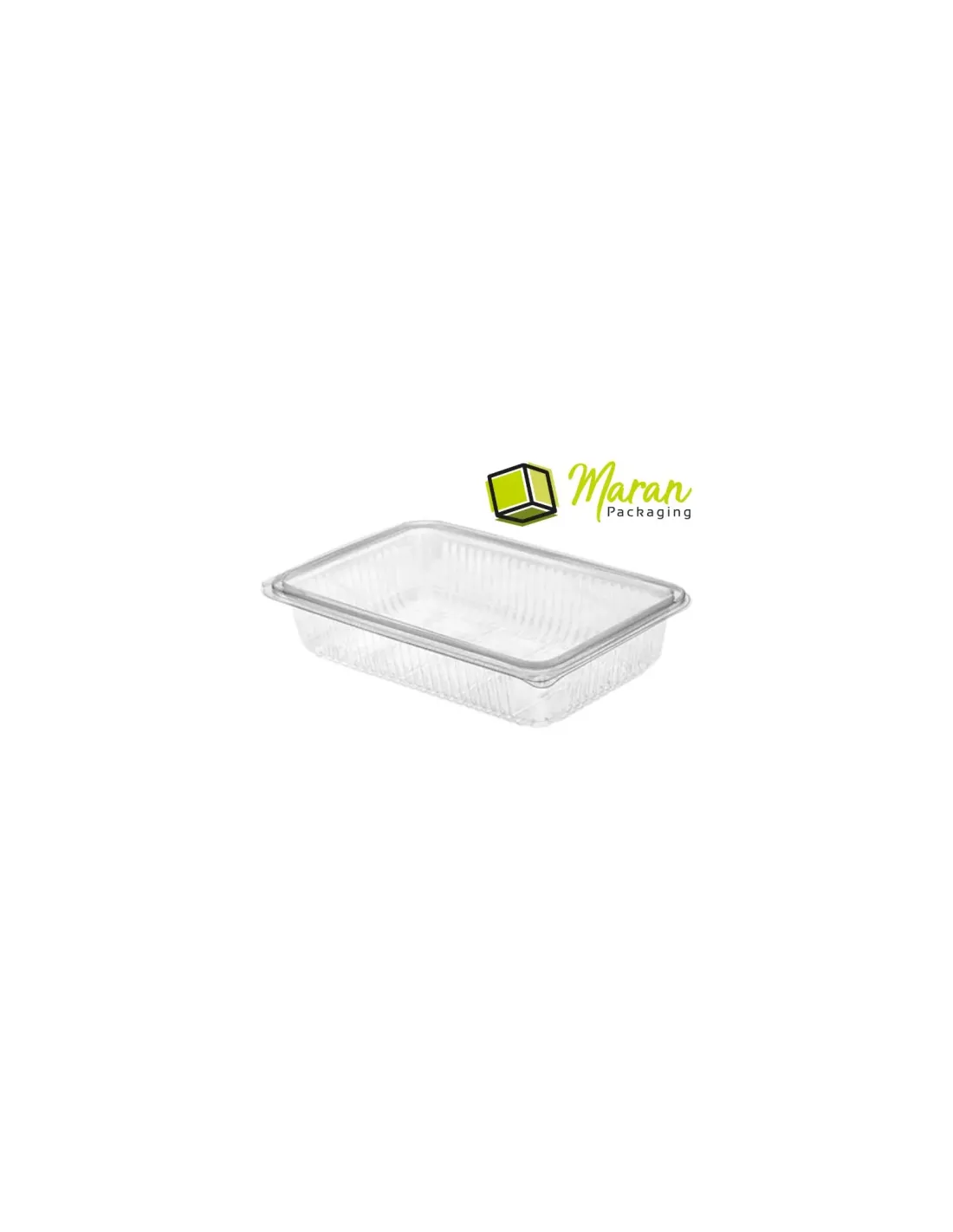 El envase loncheado, fabricado en plástico PET cristalino, destaca por su cierre hermético con bisagra, que mantiene la frescura y estructura de carnes y pescados en lonchas o tamaños medianos