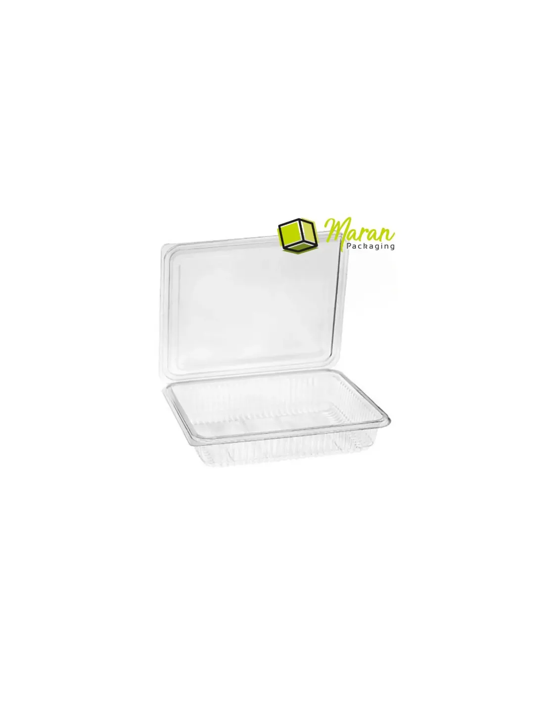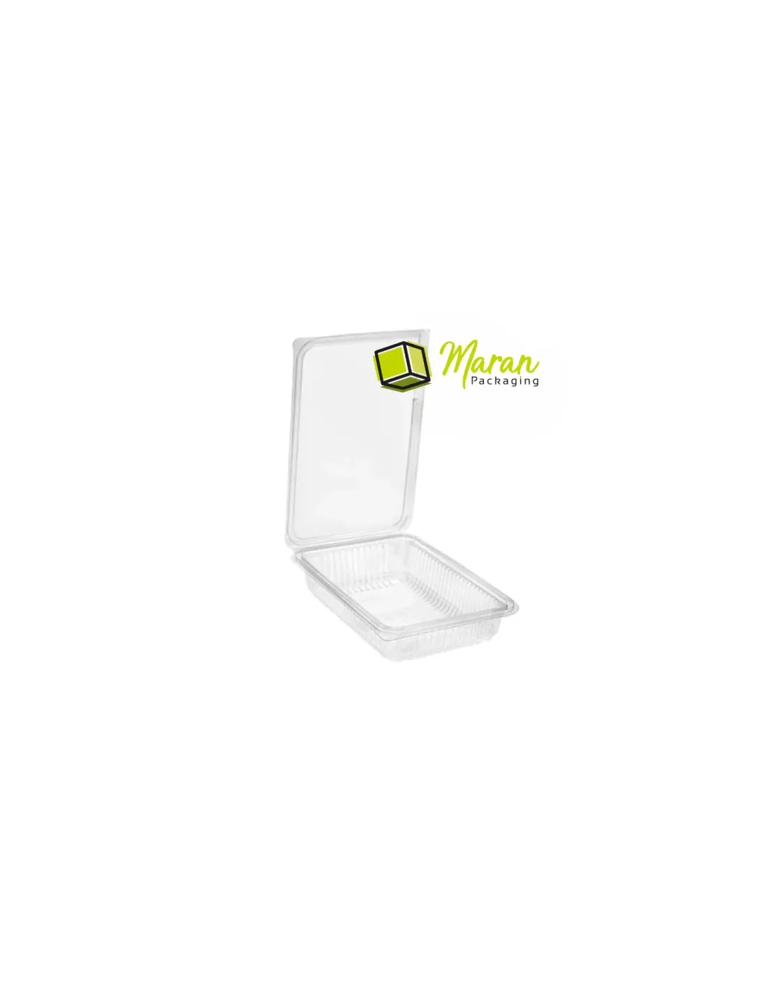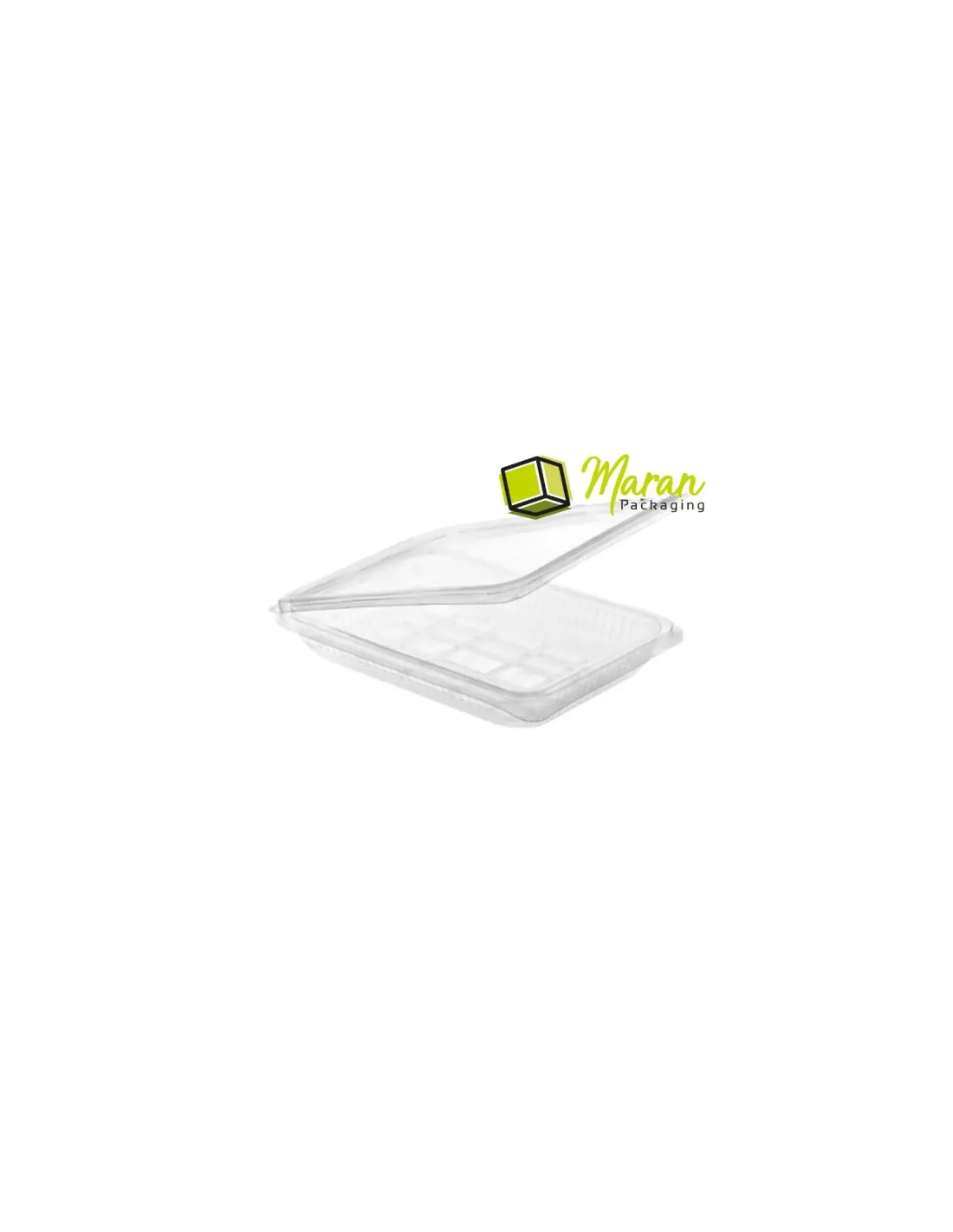 Envase PET transparente con tapa bisagra, ideal para loncheados de carnes o pescados de tamaño medio.
