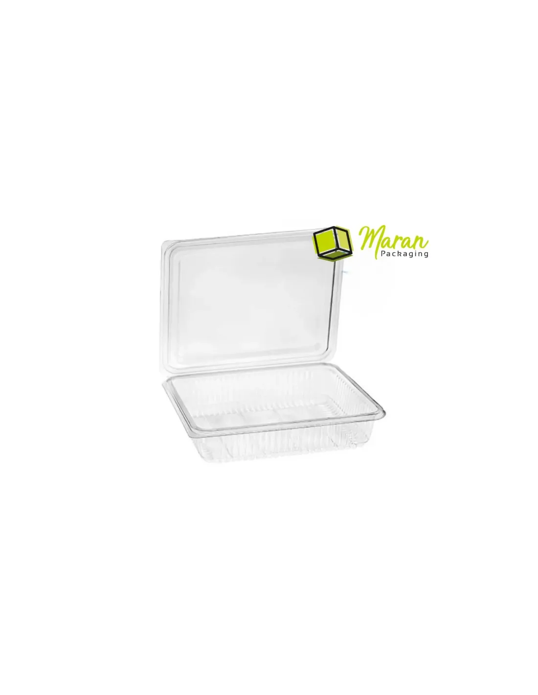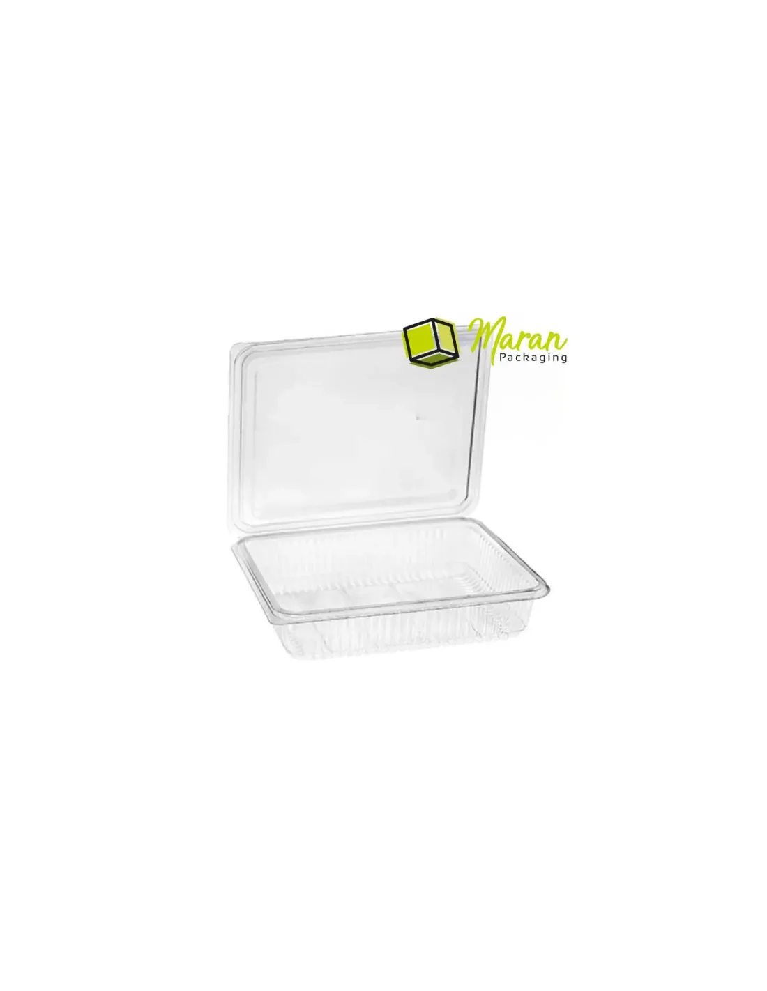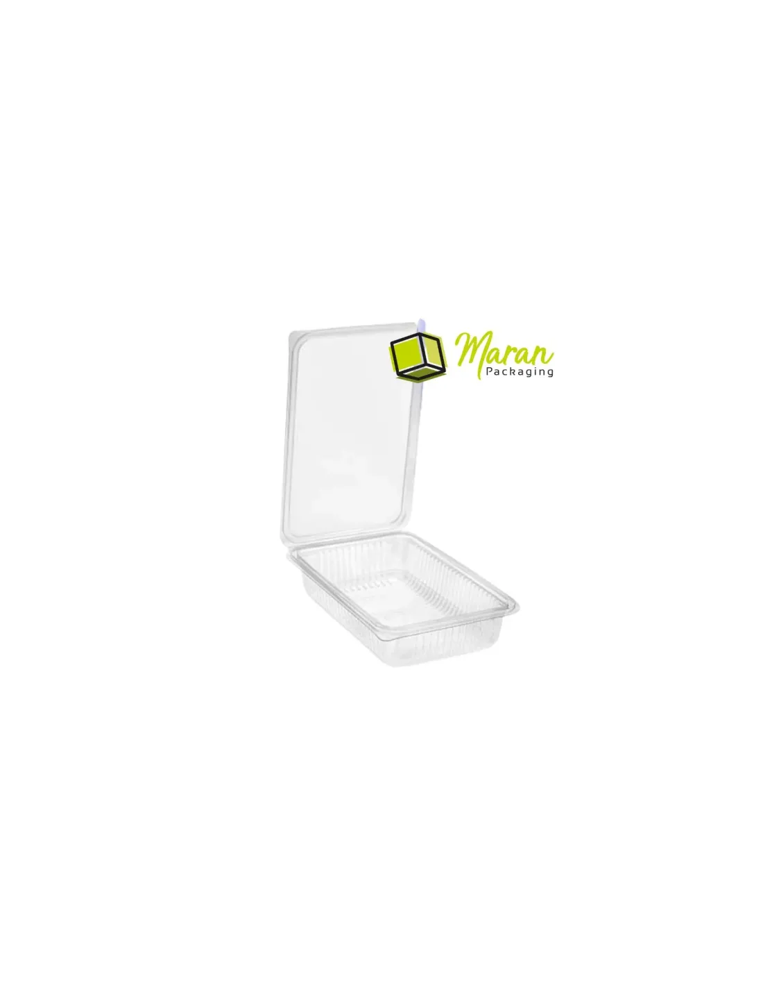 Envase PET transparente con tapa bisagra, ideal para loncheados de carnes o pescados de tamaño medio.
