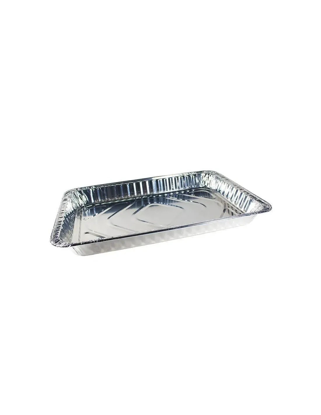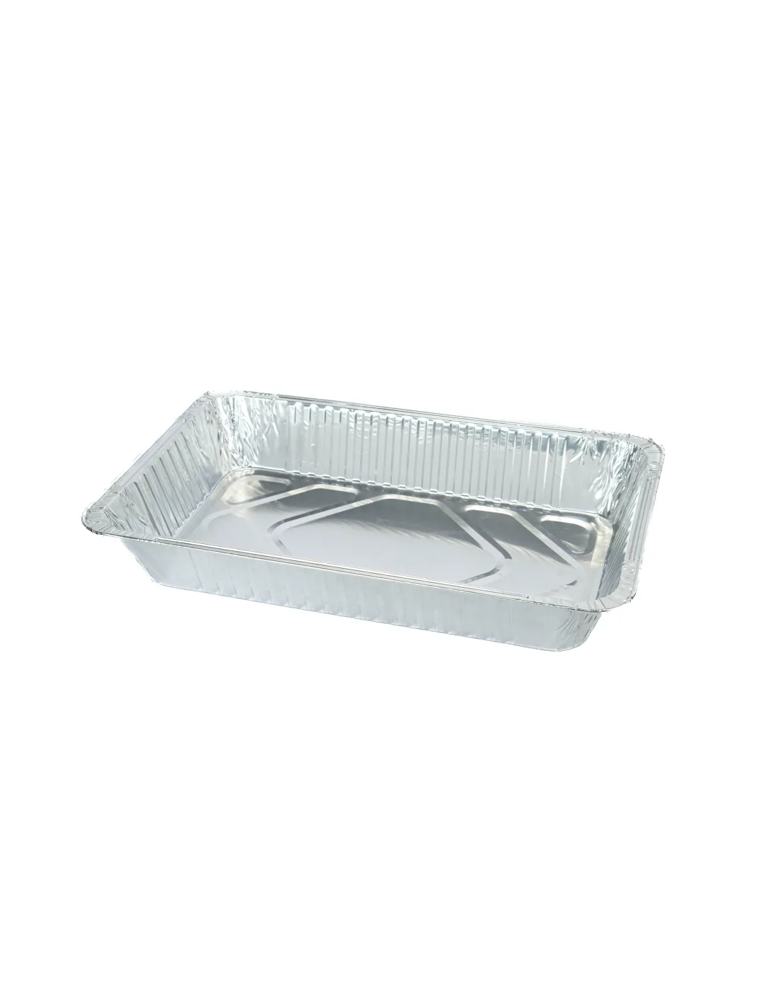 Este envase rectangular de aluminio (Ref. R885G) ofrece una capacidad de 6.500 cc y dimensiones de 52,7 × 32,6 × 5 cm, siendo ideal para contener grandes porciones de alimentos como asados, guisos, cochinillos o platos familiares. Su diseño robusto y resistente permite su uso en horno convencional, microondas, cocción al vapor y grill, soportando temperaturas de hasta +600 °C y hasta −40 °C.