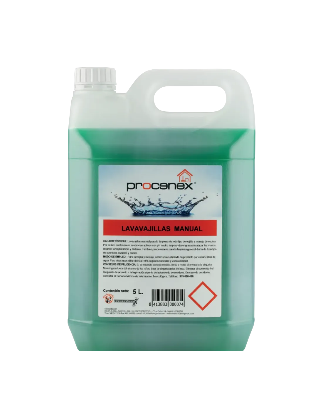 El Lavavajillas Manual PROCENEX (5 L) es un detergente líquido especialmente formulado para la limpieza de vajilla, cristalería y menaje de cocina. Su pH neutro y elevada concentración en agentes activos garantizan una limpieza profunda y un acabado brillante, sin agredir la piel